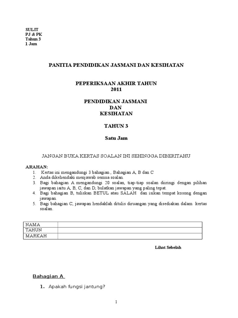 Kertas Ujian Pendidikan Jasmani Kesihatan Tahun 5 Pendidikan Jasmani Pendidikan Kertas